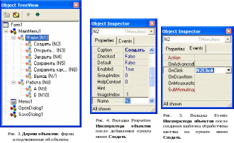 Для пункта меню Создать двойным щелчком в строке OnClick на вкладке Events в окне Инспектора объектов (см. рис. 5) или двойным щелчком на строке Создать {N2} в дереве объектов создайте шаблон обработчика события – щелчка на пункте меню Создать во время исполнения программы, и превратите его в заглушку, добавив комментарий, как показано на рис. 6.