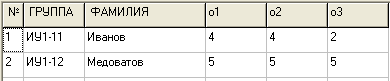 Исходный (создаваемый с использованием меню Файл) файл должен иметь тип tfz=file of tz, где tz=record No:byte; Gr:string[8]; Fm:string[12]; o1,o2,o3:2..5 end, No – порядковый номер, Gr – название группы, Fm – фамилия студента, o1,o2,o3 – оценки по предметам, а основная таблица, в которой эти данные хранятся и редактируются, должна иметь вид