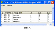 ля проверки работы. Запустите программу, наберите в строках таблицы StringGrid1 строки как показано на рис.7 и сохраните данные в файле fz.rec в текущем каталоге. Затем откройте этот файл на новой вкладке с именем fz.rec окна редактора текстов Delphi следующим образом: введите команду Файл.Открыть…, в появившемся окне диалога Open выберите в раскрывающемся списке Тип файлов: строку Any file(*.*), в списке файлов выберите fz.rec и щелкните на кнопке Открыть. Данные из файла fz.rec будут прочитаны как из текстового файла, поэтому правильно отобразятся только строковые данные (названия групп и фамилии), но не числовые, так как в типизированных файлах данные хранятся в форме внуреннего представления.