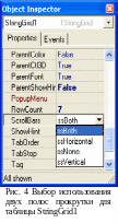 процессе выполнения заданий может возникнуть необходимость изменить параметры таблицы для отображения результатов выполняемых работ и тогда, чтобы восстановить параметры основной таблицы достаточно будет вызвать процедуру TabForFile. Если при переходе от одной структуры таблицы к другой некоторые параметры остаются неизменными и представлены соответствующими свойствами в Инспекторе объектов, то их установку можно выполнить на этапе разработки макета формы. В данном примере так сделано для установки полос прокрутки заданием свойству ScrollBars значения ssBoth (см. рис. 4) и фиксации (объявление как заголовочной) первой строки таблицы заданием свойству FixedRows значения 1, а свойству FixedCols значения 0, так как фиксированных столбцов не должно быть (см. рис 1, где первая строка выделена цветом).