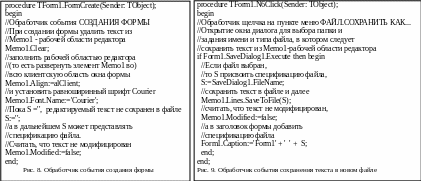 Создайте обработчик procedure TForm1.N6Click(Sender: TObject) события щелчка на пункте меню Файл\Сохранить как…, для чего сделайте двойной щелчок на соответствующей строке дерева объектов и в появившейся заглушке добавьте операторы и комментарии, как на рис. 9.
