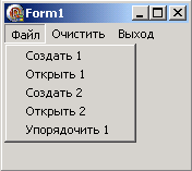 на форме (откроется редактор меню) и последовательно ввести слова Файл, Создать1, Открыть1, Создать2, Открыть2, Упорядочить 1, нажимая после каждого слова Enter, а затем ввести слово Очистить во второй пункт строки меню и слово Выход – в третий..