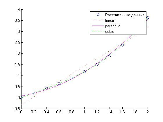 legend ('Рассчитанные данные', 'linear', 'parabolic', 'cubic')