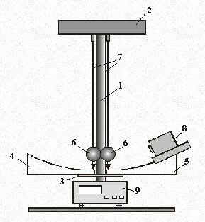 Экспериментальная установка (рис. 2) представляет собой стойку 1 с закрепленными на ней верхним 2 и нижним 3 кронштейнами. На нижнем кронштейне закреплены левая 4 и правая 5 шкалы. По правой шкале определяется начальный угол отклонения правого шара, по левой – угол отклонения левого шара после соударения.