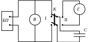 Для определения емкости конденсатора пользуются схемой, изображенной на рис. 2, где БП – блок питания, Г – баллистический гальванометр, В – вольтметр, К – двойной переключатель. В положении I переключателя К конденсатор С заряжается; при переводе переключателя в положение II конденсатор разряжается через гальванометр. В этот момент измеряют максимальное отклонение «зайчика» n по шкале.