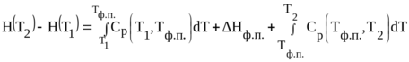 Изменение энтальпии вещества при увеличении температуры от Т1 до Т2 (при отсутствии в этом интервале температур фазовых переходов (Phase transition) может быть рассчитано по соотношению: