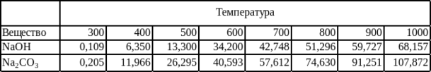 | Na OН(тв) | 300 | 350 | 400 | 450 | 500 | 550 | 566 | 595 |