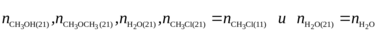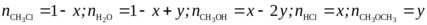 Введем обозначения: x-количество HCl, моль в равновесной смеси(в соответствии со стехиометрией реакции, такое же количество CH3Cl и H2O прореагировало и CH3OH образовалось по первой реакции); y- количество CH3OCH3,моль,в равновесной смеси (в соответствии со стехиометрией такое же количество H2O образовалось и в два раза большее количество CH3OH прореагировало по второй реакции).