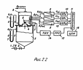 | 1 - Трубовоздуходувка. 2 - Регулирующая задвижка. 3 - Ресивер. 4 - Сопло. 5 - Электродвигатель. 6 - Зонд. 7 - U-образный манометр. 8 - Выхлопная камера. 9 - Манометр-преобразователь. 10 - Цифровой измерительный вольтметр. 11 - Транскриптор. 12 - Электроуправляемая пишушая машина. 13 - Программный реверсный счетчик. 14 - Пульт дистанционного управления. |