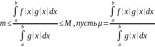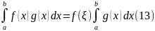 1‒я формула среднего значения в обобщенной форме (13). Пусть f (х) и g(х) интегрируемы на [а, b] и т и М ‒ точные грани f (х) на [а, b]. Пусть g(х) ≥ 0 (или g(x) ≤ 0) на всем [а, b]. Тогда Ǝ μ, где т ≤ μ ≤ М, что Если f (х) непрерывна на [а, b], то Ǝ ξ ∈ [а, b]: Если