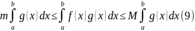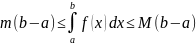 Пусть Мi и mi ‒ точные грани f (x), Мi' и mi' ‒ точные грани | f (x)| на [хi‒1, хi]. Легко убедиться, что Мi' ‒ mi' ≤ Мi ‒ mi (рассмотреть cлучаи: 1) Мi , mi ≥ 0, 2) Мi , mi ≤ 0, 3) Мi >0, mi ≤ 0 ) => S1 ‒ s1 ≤ S ‒ s => если для некоторого разбиения S ‒ s < ε, то для него S1 ‒ s1 < ε => |f(x) | интегрируема. ‒| f (х)| ≤ f (х) ≤ | f (х))| => 4°. Пусть f (х) и g(х) интегрируемы на [а, b] и g (х) ≥ 0. Тогда, если М и т ‒ точные грани f (х) на [а, b], то: