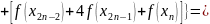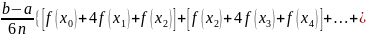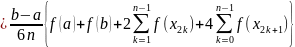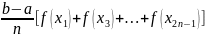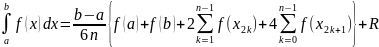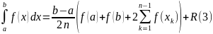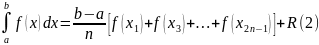 Применяя к каждому из этих интегралов формулы (5) и (6), получим (3) с остаточным членом (4). Метод прямоугольников. Разобьем [a, b] на п равных частей точками а = х0 <х1 < ... < хп = b. Пусть x2k‒1 ‒ средняя точка [x2k‒1, x2k]. Метод прямоугольников: замена интеграла (1) суммой