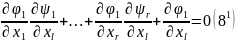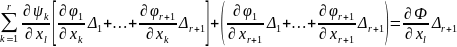 По условию теоремы он = 0 всюду в окрестности М0. Умножим равенства (81) ‒ (8r+1) на соответствующие алгебраические дополнения Δ1, .... Δr+1 элементов последнего столбца (10) и сложим
