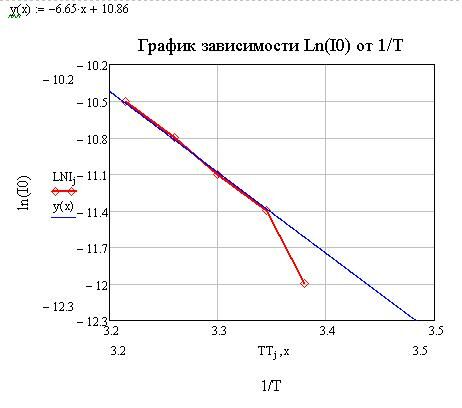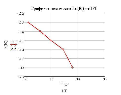 Полученные результаты хорошо согласуются с теоретическими. С увеличением температуры, тепловой ток через диод при обратном подключении увеличивается. Наглядно представлена несимметричность реального p-n перехода (отклонение реального графика от теоретически построенной прямолинейной зависимости) связанная с наличием омических потерь. Построенная в логарифмическом масштабе экспериментальная зависимость силы тока от 1/T представляется собой практически прямую линию, по наклону которой определяется ширина запрещенной зоны германия. Экспериментально полученное значение ширины запрещенной зоны найдено с 2% погрешностью.