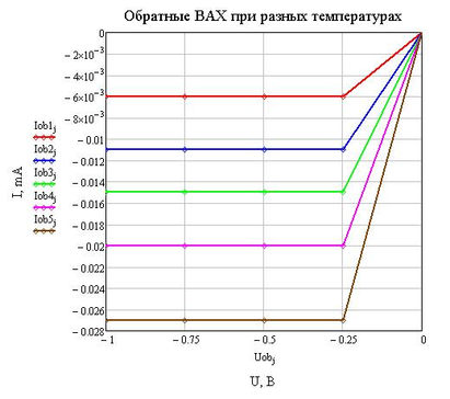 Обратные ветви ВАХ p-n перехода при разных температурах