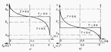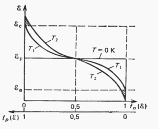 Если уровень Ферми F находится в разрешенной зоне, то он разделяет заполненные и незаполненные её части. Если температура сравнительно низкая, то все уровни, лежащие ниже уровня Ферми заполнены электронами, и все уровни находящиеся выше уровня Ферми свободны.