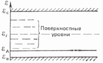 Особую роль в любом реальном полупроводнике играет его поверхность. Структурные нарушения кристаллической решетки и наличие адсорбированных атомов создают вблизи поверхности дополнительные энергетические уровни, называемые поверхностными. Эти уровни могут занимать различное положение на энергетической диаграмме, чаще всего они находятся в пределах запрещенной зоны (рис. 3.1, 6).
