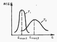 | Рис. 3.8. Функция распределения Максвелла — Больцмана при температурах Т1 и Т2 (Т2>Т1) | ||