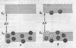 Рассмотрим собственный полупроводник. При температуре Т=0 К все энергетические уровни валентной зоны заполнены электронами, а уровни зоны проводимости свободны. С повышением температуры некоторое количество электронов покидает валентную зону и переходит в зону проводимости (рис. 3.2).