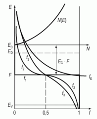 Функция Ферми – Дирака (3.3), (3.4) справедлива не только для собственных, но и для примесных полупроводников. Степень или уровень легирования определяется количеством примесных атомов в единице объема полупроводника.В полупроводниках n-типа большое количество электронов переходит в зону проводимости с уровней доноров, при этом дырки в валентной зоне не появляются. Поэтому вероятность появления электрона в зоне проводимости выше вероятности появления дырки в валентной зоне. Это, очевидно, возможно в том случае, если уровень Ферми F‚ будет смещен от середины запрещенной зоны