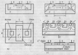 | Рис. 17.6. Конструкции полевых транзисторов с управляющим рn-переходом; изготовленного методом двойной диффузии (а); по планарной эпитаксиально-диффузионной технологии (б); с электростатическмм и приповерхностным затвором (в); конструкция полевого транзистора с барьером Шоттки (г) |