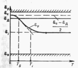В невырожденном донорном полупроводнике при температуре абсолютного нуля уровень Ферми находится посередине между дном зоны проводимости и уровнем донорной примеси. При повышении температуры уровень Ферми стремится к середине запрещенной зоны (рис. 4.2).