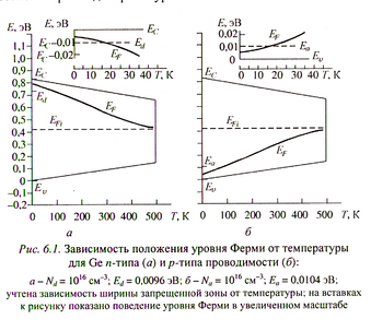 В акцепторном полупроводнике, как и в случае донорной примеси, при повышении температуры наступает область истощения, характеризующаяся полной ионизацией атомов акцепторной примеси. С дальнейшим ростом температуры уровень Ферми поднимается к середине запрещенной зоны и полупроводник ведет себя как собственный. На рис. 4.5 представлены зависимости положения уровня Ферми от температуры для Ge n-типа (а) p-типа (б).