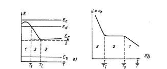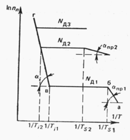 На рис. 4.3 приведена температурная зависимость концентрации электронов в зоне проводимости для полупроводника n-типа. На кривой имеются три характерных участка: аб – для примесной электропроводности, бв – для области истощения принеси и вг – для собственной электропроводности.