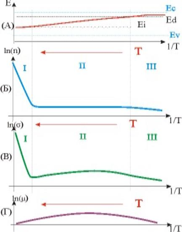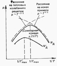 Экспериментальные исследования температурной зависимости подвижности показывают, что при низких температурах преобладает рассеяние на ионах примеси, а при более высоких – рассеяние на тепловых колебаниях решетки.
