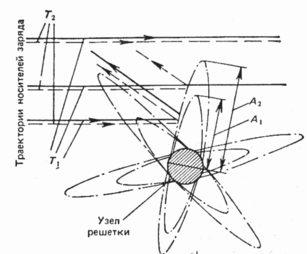 | Рис. 4.8. Рассеяние носителей заряда на тепловых колебаниях решетки при различных температурах (Т2>Т1); А1 и А2 -амплитуды колебаний узлов решетки при температурах Т1 н Т2 |