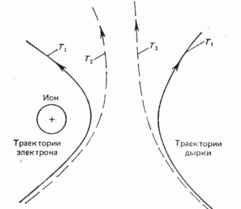 Кулоновское поле, созданное ионизованной примесью, действует на большом расстоянии и вызывает отклонение траектории носителей, движущихся даже сравнительно далеко от атома примеси, как показано на рис. 4.7. Величина свободного пробега при рассеянии на примесных атомах должна быть обратно пропорциональна концентрации этих атомов