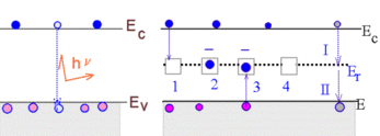 Вероятность межзонной рекомбинации очень мала, более вероятны переходы носителей заряда через локальные уровни, расположенные в запрещенной зоне, т.е. ловушечная рекомбинация или рекомбинация Шокли-Рида (рис. 5.6).