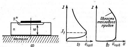 Если не принять специальных мер для ограничения тока, то диод выходит из строя. Предпосылкой для возникновения теплового пробоя служат большие значения обратного тока, поэтому этот тип пробоя легче возникает в приборах, изготовленных на основе материалов с небольшой шириной запрещенной зоны. Так, например, в высоковольтных германиевых диодах он может иметь место уже при комнатных температурах. В диодах на основе Si и GaAs он может иметь место при высоких температурах, когда значения обратных токов становятся большими.
