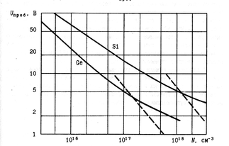для германиевых и кремниевых pn-переходов показана на рис. 10.3 штриховыми линиями. Из рисунка видно, что туннельный пробой в германиевых pn-переходах имеет место при концентрациях примеси, превосходящей 1017 см-3, а в кремнии – соответственно 1018 см-3.