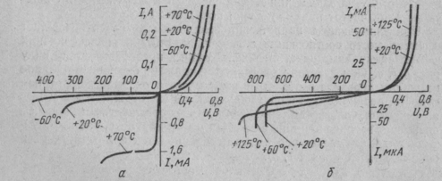 | Рис. 14.5 ВАХ диодов при различных температурах: а – германиевый диод; б – кремниевый диод. Резкое возрастание тока при больших обратных напряжениях обусловлено пробоем pn-перехода |