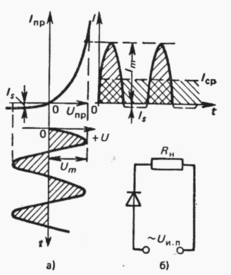 Выпрямительный, или силовой, диод – прибор, предназначенный для выпрямления переменного тока . Кроме того их применяют в цепях управления и коммутации, для развязок в электрических цепях, ограничения выбросов напряжений в цепях с индуктивными элементами, а также в цепях, где необходимы вентильные элементы и не предъявляется жестких требований к временным и частотным параметрам.