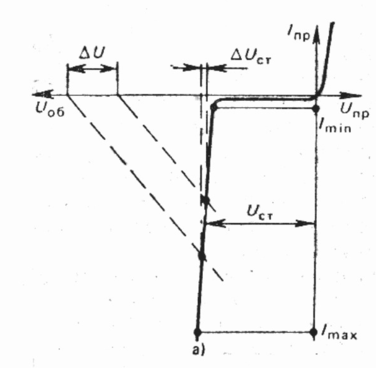 Стабилитрон (опорный диод) – полупроводниковый диод, предназначенный для стабилизации напряжения. Стабилитроны используют также в качестве ограничителей постоянного или импульсного напряжения, элементов межкаскадной связи, источников эталонного напряжения и др. На ВАХ стабили тронов имеется участок со слабой зависимостью напряжения от тока. Такой участок ВАХ наблюдается у диодов, работающих в режиме туннельного или лавинного пробоя. На рис. 14.6, а приведена идеальная ВАХ стабилитрона. До наступления пробоя стабилитроны имеют очень большое статическое сопротивление (порядка 1 МОм), после пробоя – очень малое дифференциальное сопротивление (
