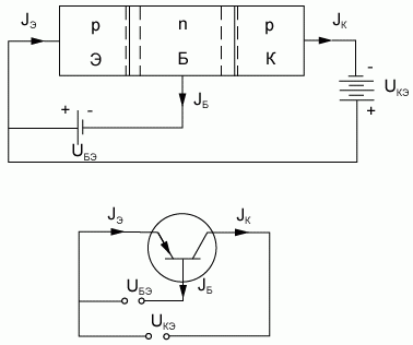 В транзисторе, включенном по схеме с общим эмиттером, имеет место усиление не только по напряжению, но и по току. Входными параметрами для схемы с общим эмиттером будут ток базы IБ, и напряжение на базе относительно эмиттера UБЭ, а выходными характеристиками будут ток коллектора IК и напряжение на коллекторе UКЭ. Для любых напряжений: