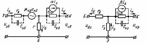 | Рис. 15.33. Т-образные схемы замещения транзистора, включенного в схемы с ОБ (а) и с ОЭ (б) |