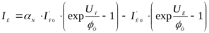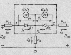 На рисунке схема замещения транзистора обведена штриховой линией. Источники тока управляются токами диодов, сами диоды считаются идеальными.