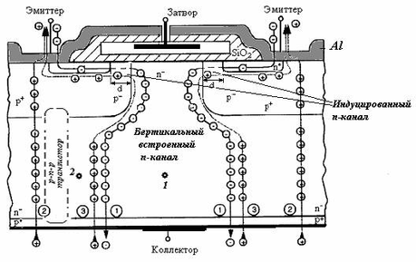 На рис. 18.11 приведена структура IGBT c планарным затвором, а также показаны пути движения носителей заряда как через элементы IGBT, так и через специально встроенный биполярный транзистор.