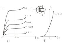 Как видно из графиков, на характеристиках МДП-транзистора можно выделить две области: участок крутого нарастания тока стока Ic с увеличением напряжения Uси и пологий участок, на котором Ic меняется незначительно, поэтому эту область часто моделируют горизонтальными прямыми вплоть до напряжения пробоя.
