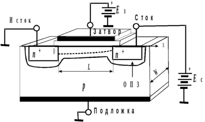 инверсия в некоторой, находящейся вблизи стока точке отсечки исчезает, канал перекрывается областью, обедненной носителями. При этом дифференциальное сопротивление выходной цепи сток-исток резко увеличивается, так как оно определяется сопротивлениями канала и обратносмещенного стокового pn-перехода.