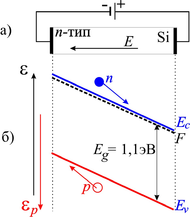 )! Другими словами, при приложении больших прямых смещений электроны начнут «убегать» от батареи смещения и все зоны станут наклоняться аналогично рис. 3.2.