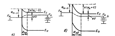 . Поскольку удельное сопротивление полупроводника много больше, чем удельное сопротивление металла, можно считать, что падение напряжения, возникающее в рассматриваемой структуре полностью приложено к области потенциального барьера полупроводника. Важно подчеркнуть, что внешнее напряжение может только выпрямить границы разрешенных зон (при