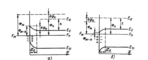 Рассмотрим контакт металл-полупроводник. Допустим, что имеется контакт между металлом и невырожденным электронным полупроводником. Если уровень Ферми изолированного металла Fм лежит ниже уровня Ферми полупроводника Fп, т.е. Φм>Φп (рис. 19.1), то в момент соприкосновения поток электронов из полупроводника превышает поток электронов из металла. В результате металл в области контакта приобретает отрицательный заряд, а полупроводник – положительный и возникшее между контактирующими образцами электрическое поле