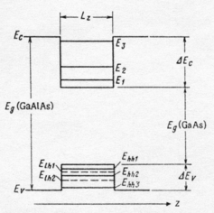 , то есть составлять десятки ангстрем. Современная технология позволяет выращивать квантоворазмерные структуры из различных материалов: InP-InAlPAs, InP-InGaPAs, GaAs-AlGaAs. На рис. 7.6,а представлена энергетическая структура системы GaAs-AlGaAs. Здесь E1, Е2 представляют энергетические состояния электронов Ehh1, Еhh2, Еhh3 – состояния тяжелых дырок, Elh1, Еlh2 – состояния легких дырок. На рис. 7.6,б представлена соответствующая диаграмма плотности состояний.