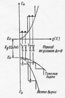 Полупараболы, представляющие собой край зоны проводимости Ec и валентной зоны Ev, соответствуют плотностям состояний объемного полупроводника. Ступенчатое изменение плотности состояний характеризует структуру с квантовыми ямами. Междузонные рекомбинационные переходы (правило отбора