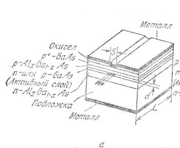 Современные полупроводниковые лазеры – многослойные структуры (рис. 7.6) имеют следующие преимущества: уменьшение рабочего тока вследствие малой площади активной полоски; улучшение условий теплоотвода вследствие двумерного растекания энергии в толще диода; уменьшение деградации приборов вследствие удаления почти всего pn-перехода от поверхности кристалла.