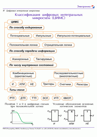 С помощью цифровых микросхем преобразуются, обрабатываются сигналы, изменяющиеся по закону дискретной функции. Частным случаем цифровых микросхем являются логические микросхемы, выполняющие операции с двоичным кодом, которые описываются законами логической алгебры. В цифровых ИС сигналы имеют два дискретных уровня (0 и 1), т.е. служат для преобразования и обработки дискретных сигналов.